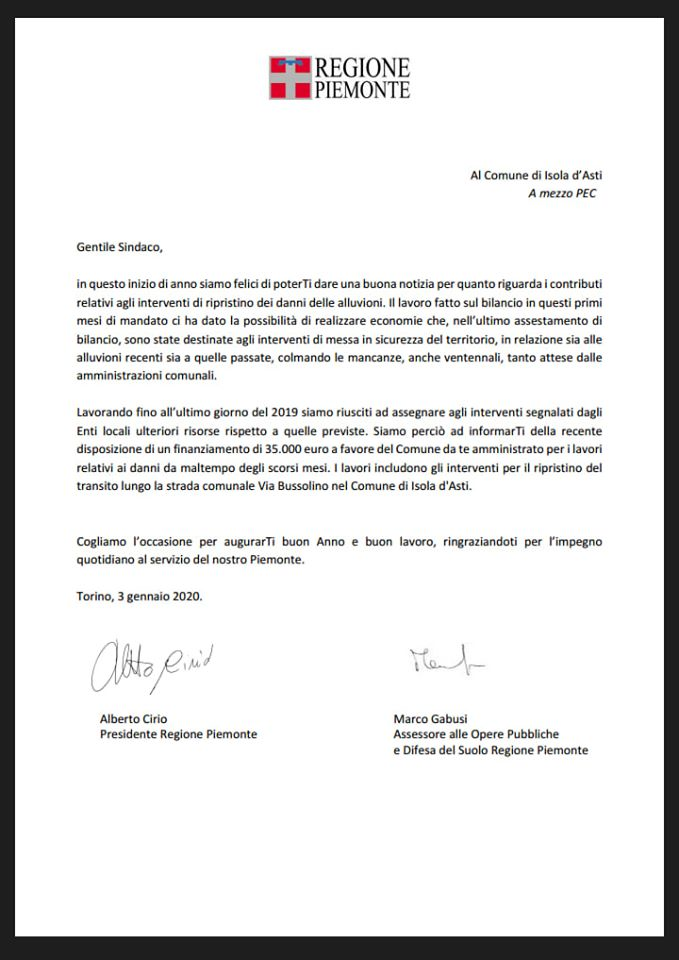 Lettera dalla Regione Piemonte - 4 gennaio 2020